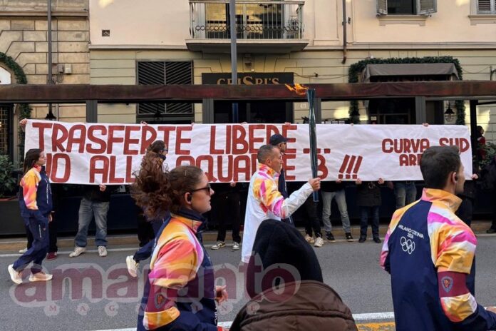 In via Crispi faceva bella mostra di sé uno striscione firmato dalla curva sud Lauro Minghelli con la scritta “Trasferte libere, no alle squadre B”. I gruppi hanno commentato così: “Approfittando del passaggio della Fiamma Olimpica abbiamo voluto esprimere, ancora una volta, il nostro disappunto”.