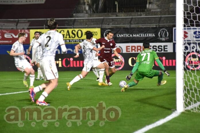 DI CHIARA 6 Prima volta dall’inizio con la maglia amaranto. Non fa faville ma con Kerrigan se la gioca alla pari: qualche volta deve rinculare non senza affanni, qualche volta sfonda di là dalle linee avversarie con padronanza. Efficace e intelligente l’assist per l’1-1 di Cianci. Poi resta negli spogliatoi (1′ st Righetti 5 Un tiro da lontanissimo intercettato da D’Alterio e poco altro. Il suo ingresso non produce gli effetti sperati).